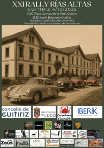 O próximo sábado, 4 de outubro, celebrarase o XXI Rally Rías Altas Clásico no Concello de Guitiriz, organizado coa colaboración do Moto Club Coruña Escudería Centollo e o Iberik Gran Balneario de Guitiriz. A tradicional proba dará comezo a partir das 16:00 horas, con saída desde a praza do Campo da Feira de Guitiriz e chegada ao Gran Balneario, sobre ás 20:35 horas.